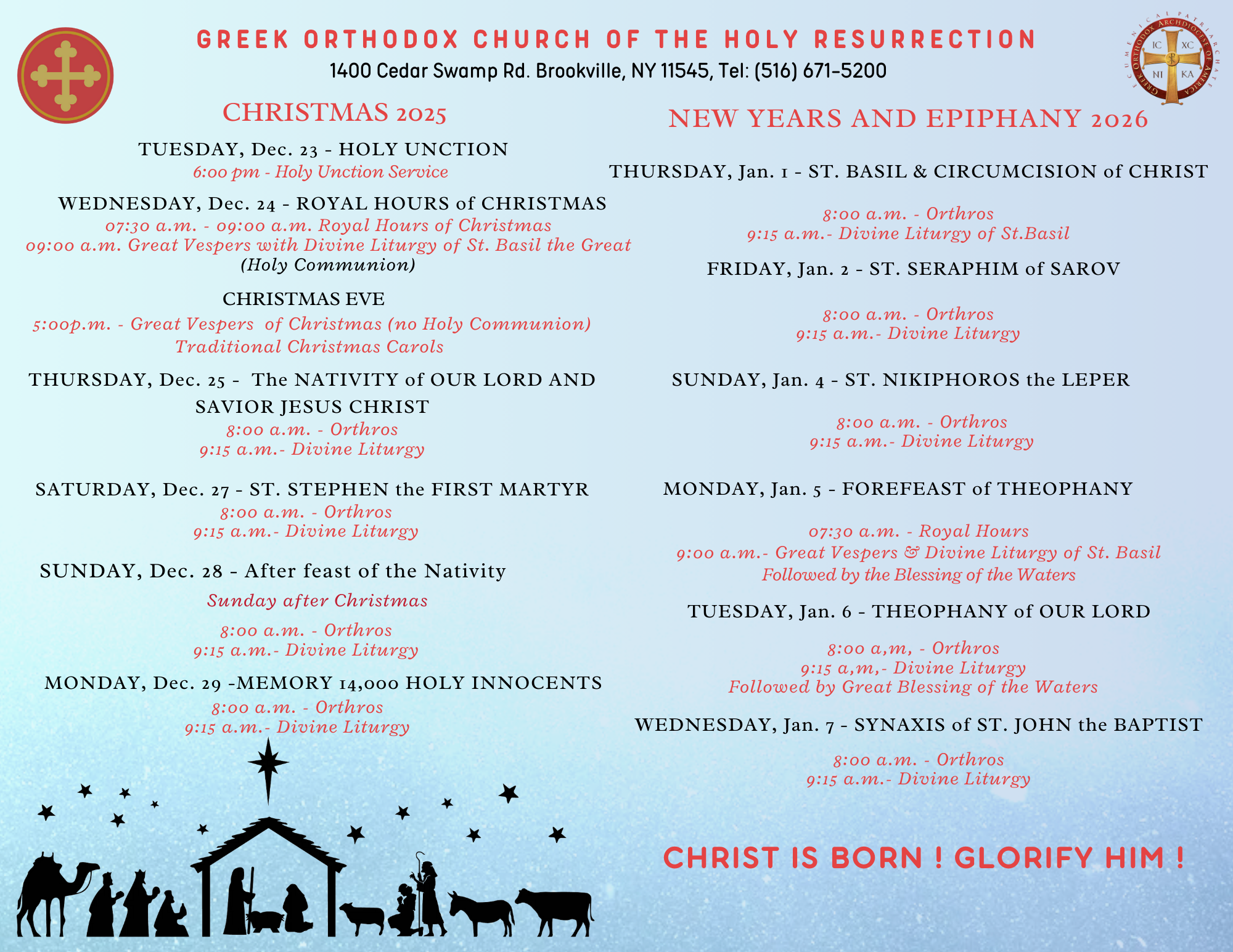 The Greek Orthodox Church of the Holy Resurrection is a parish under the spiritual and ecclesiastical shepherding of His Eminence Archbishop Elpidophoros of America of the Greek Orthodox Archdiocese of America, under the jurisdiction of the Ecumenical Patriarch of Constantinople.
