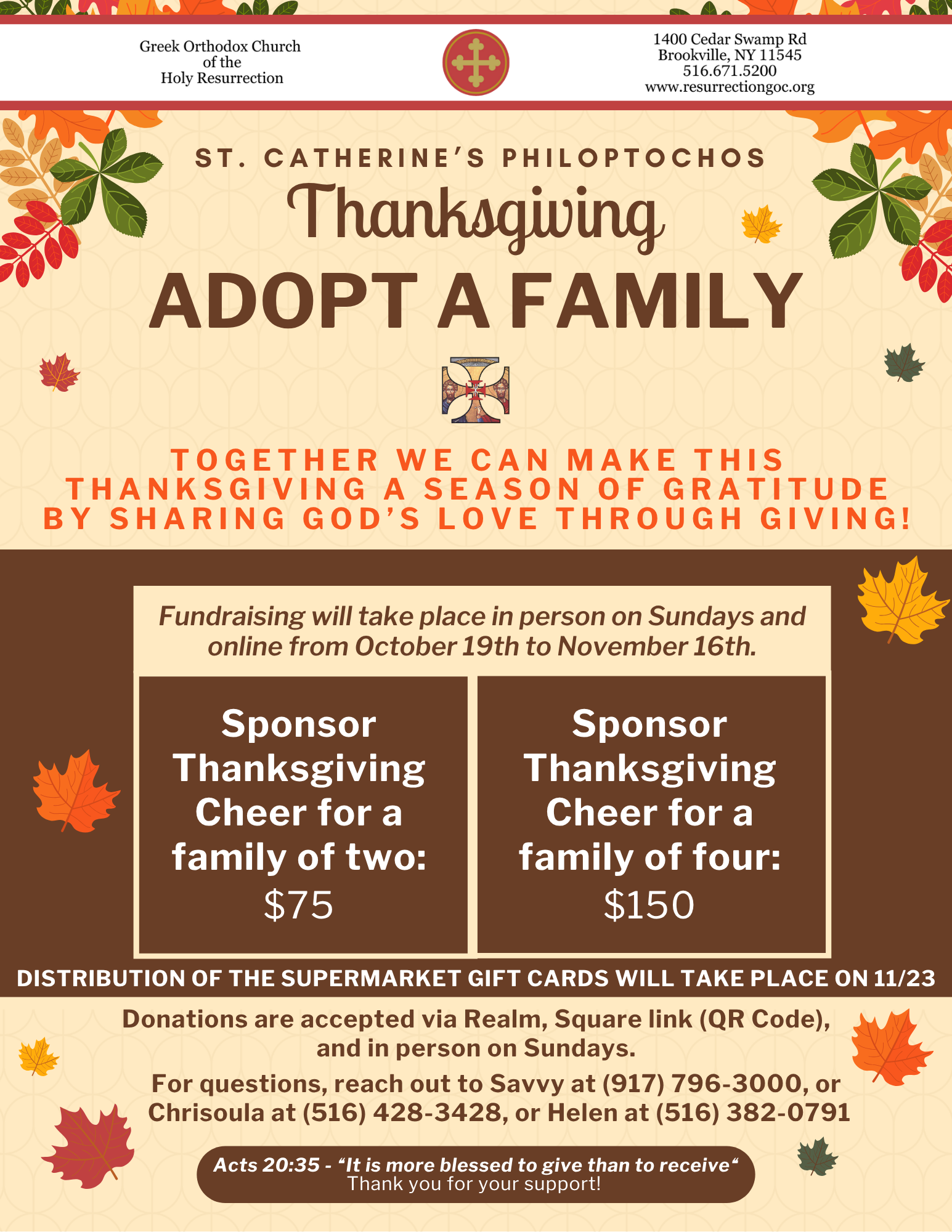 St. Catherine’s Philoptochos’ 2025 ADOPT - A FAMILY for THANKSGIVING "Blessed is the one who lightens the life of another" We ask your Generosity and Stewardship in helping our Philoptochos as they help those families in need during Thanksgiving!
