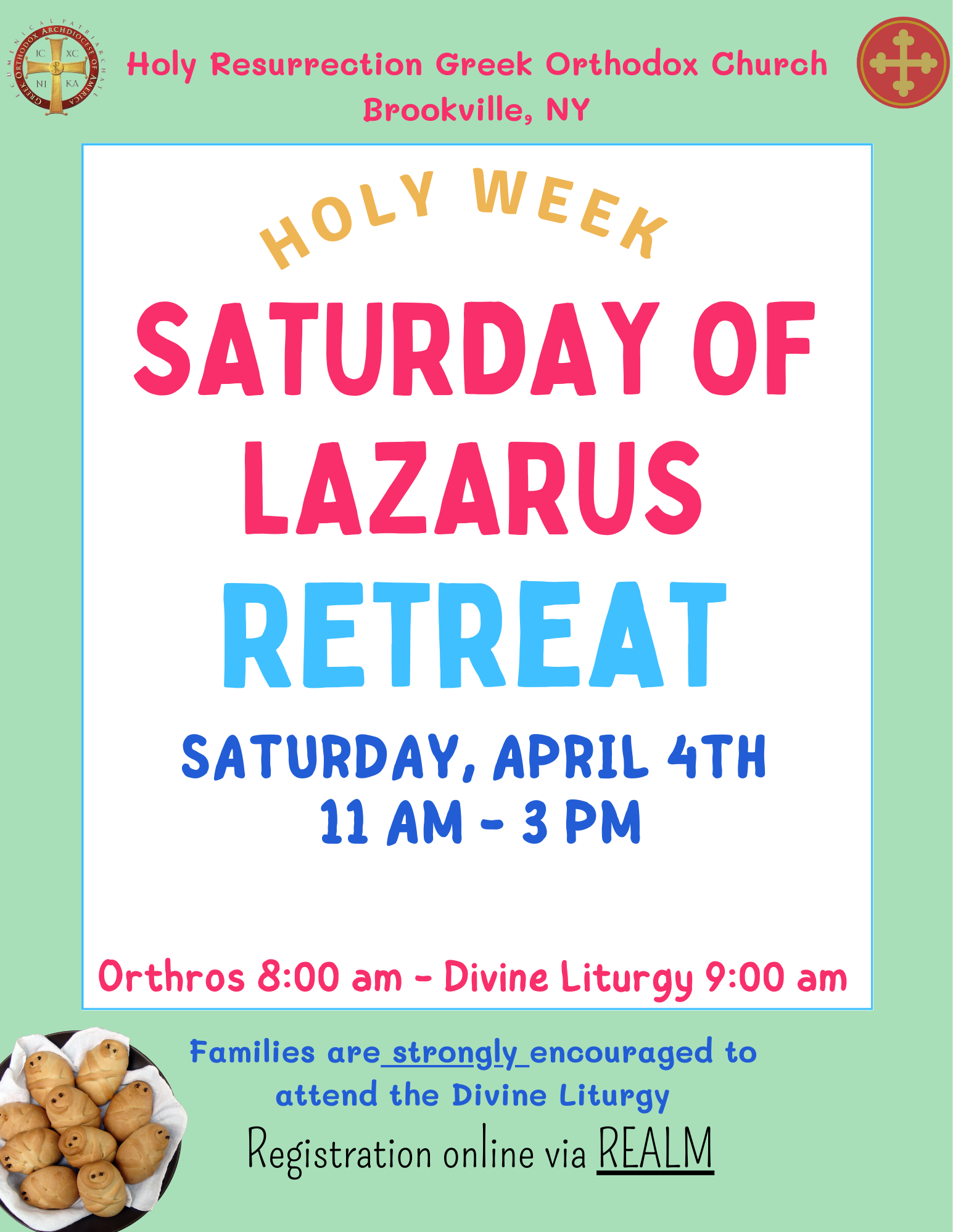 Ages for this retreat are 5-12 years old. Saturday April 4th 11am - 3pm Orthos 8:00am Divine Liturgy 9:00am Retreat Immediately Following Divine Liturgy